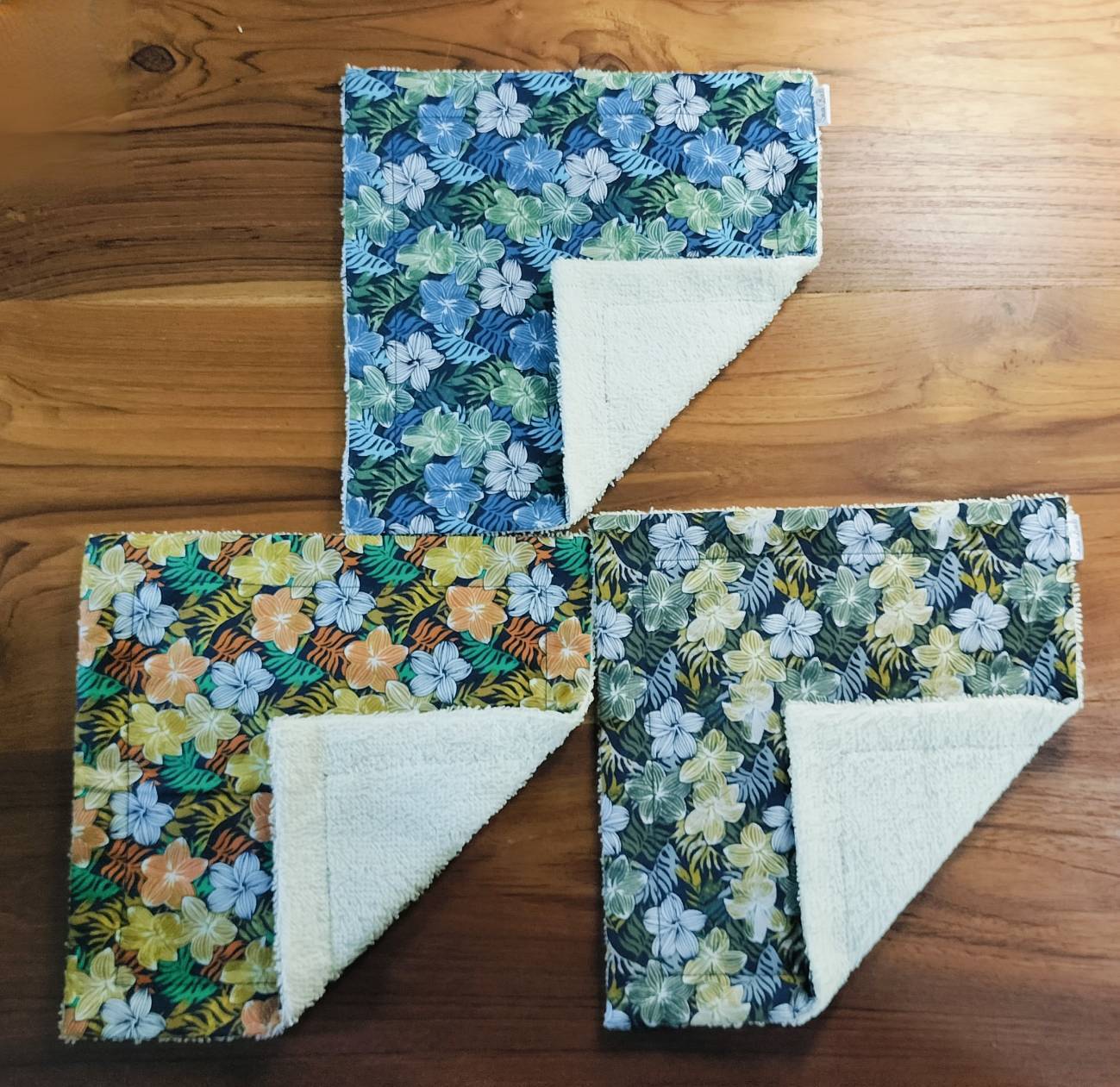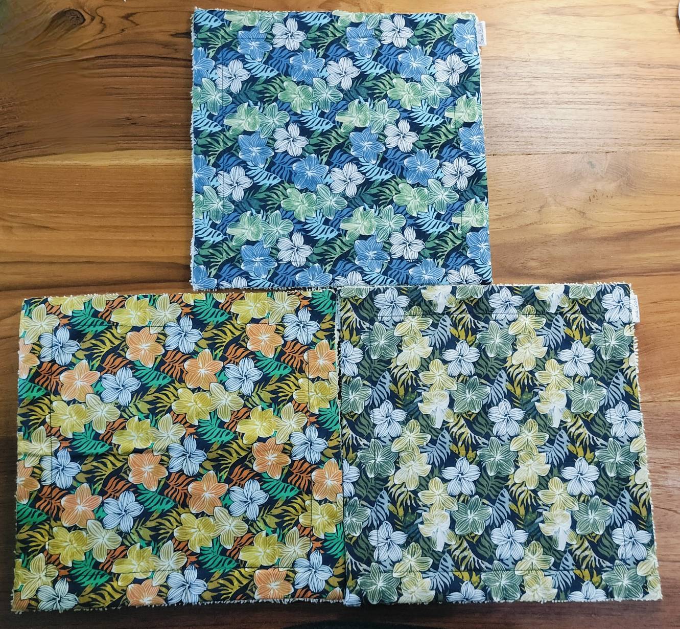 サイズは20cm✖️20cm。裏地はクリーム色の柔らかなタオル生地になっており、肌触りも抜群です。バリ島の美しいフランジパニのプリントが施され、日常使いはもちろん、ギフトにも最適です!