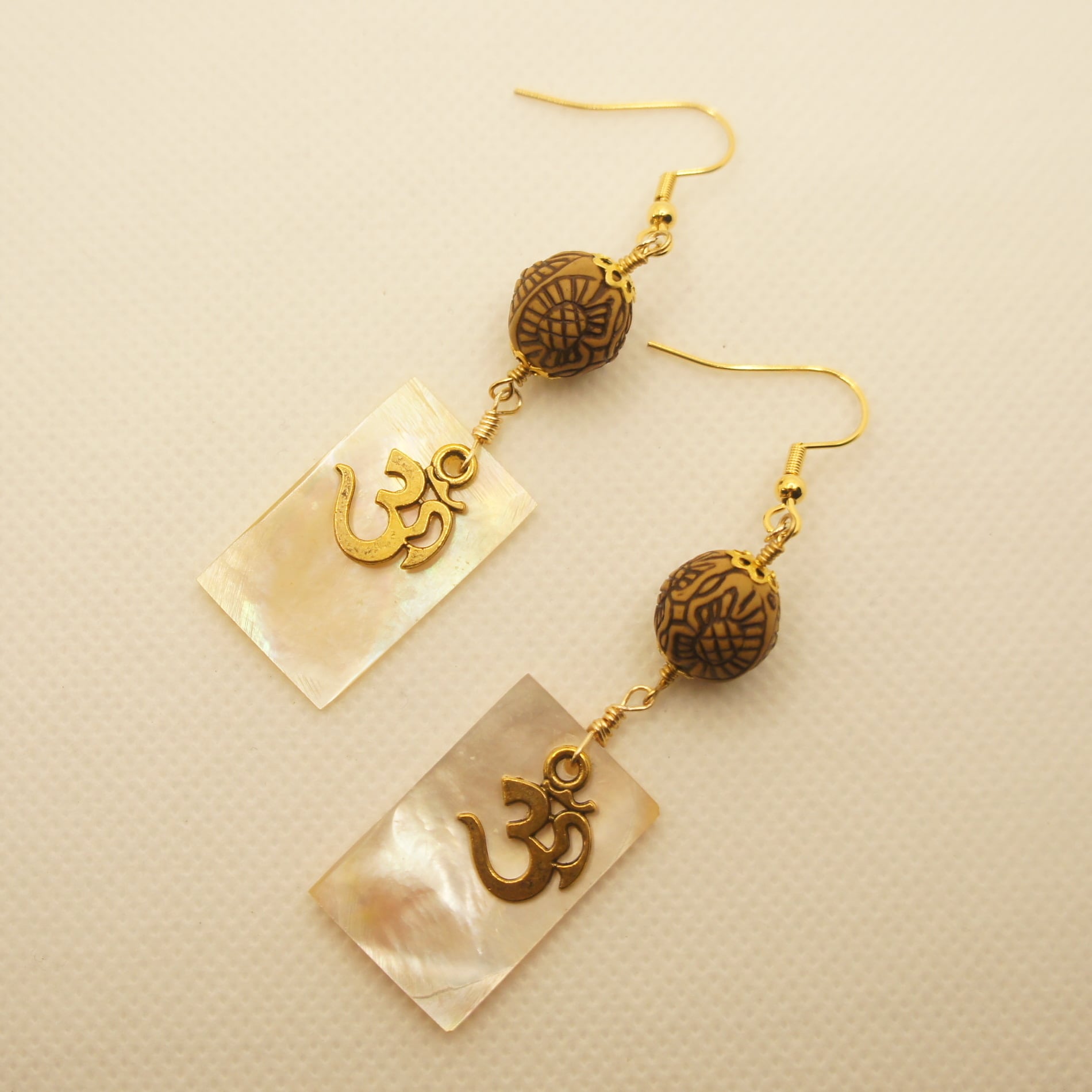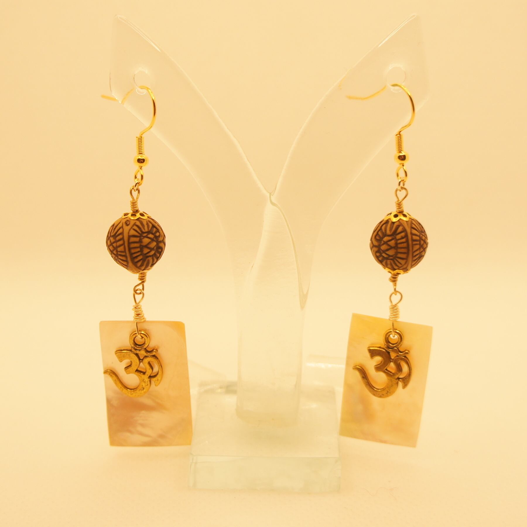 バリ島の木目ピーズ&シェルとオームのハンドメイドピアス